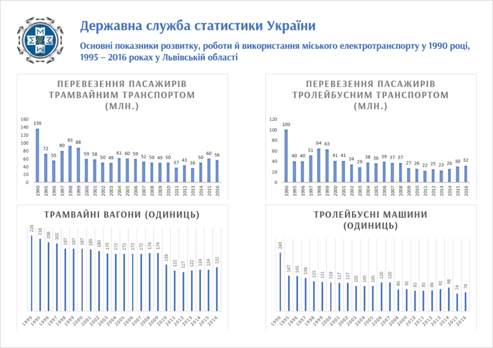Тоді у Львові їздило 243 тролейбуси, 226 трамваїв і порядку 400 автобусів ( ЛАЗ, ПАЗ, ЛІАЗ). Що ми маємо сьогодні, а це випуск на лінію наступний: 55 тролейбусів і 65 трамваїв і під 400 автобусів. У Львові від 1990 року кількість тролейбусів зменшилась на 188 одиниць і на 161 одиниць зменшилося трамваїв. Кількість автобусів залишилась та сама, але третина із них малої вмістимості.