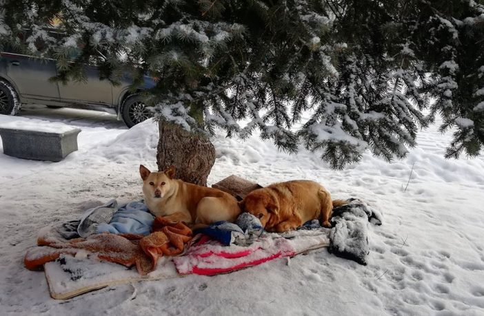 Цієї зими, каже волонтерка, собак вирішили позбутись: забирали підстилки, виганяли. За словами Наталі Копейко, волонтери, що опікувались собачою парою, дізнались від працівників спорткомплексу Sportlife та маркету «Фуршет», що власник будівлі, в якій вони розташовані, розпорядився отруїти собак і навести лад під ялинкою.