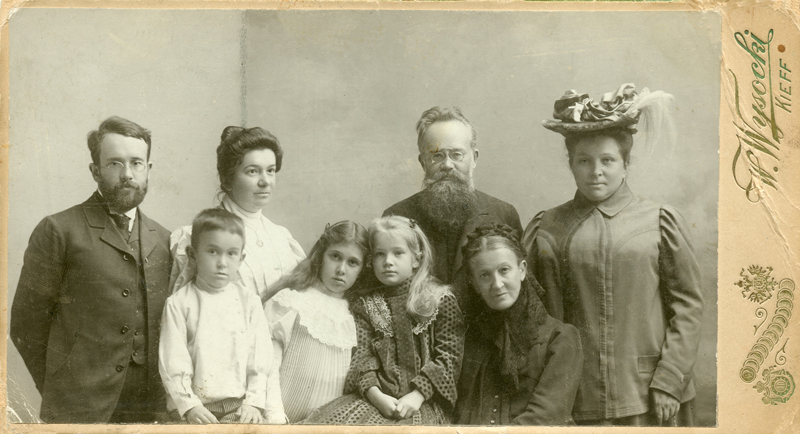 | Катерина Грушевська в родинному колі. Стоять: Олександр Грушевський, Ганна Шамраєва, Михайло Грушевський, Марія Грушевська. Сидять: Сергій та Ольга Шамраєви, Катерина Грушевська, Глафіра Грушевська. Київ, [грудень 1906 р.]. |