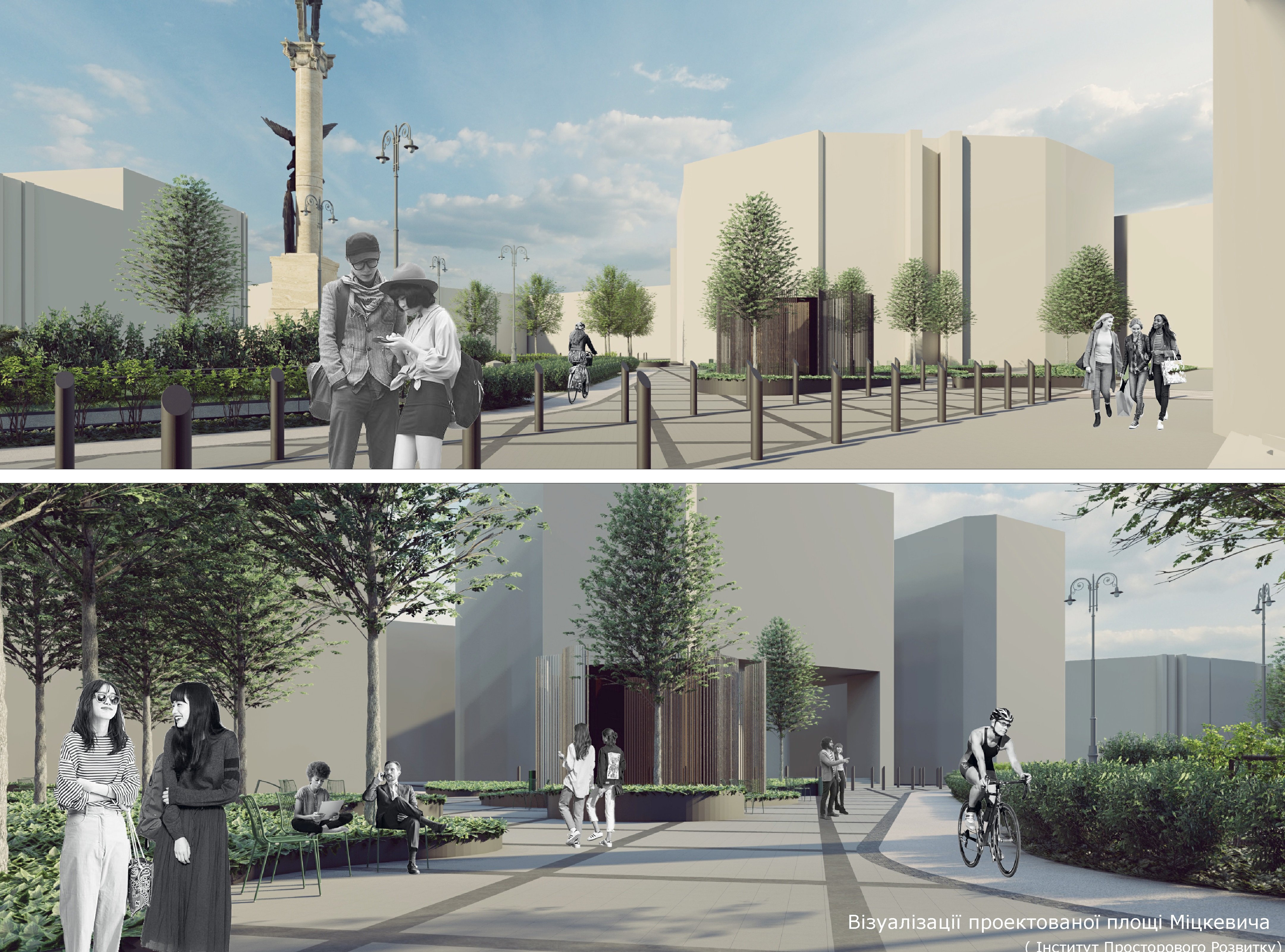 Саму площу Міцкевича реконструюють та зроблять пішохідною, а також змінять організацію дорожнього руху. Зокрема одну зі смуг руху ліквідують і перенесуть як додаткову перед пам’ятником. Поблизу наявного підземного переходу, який планують зберегти, мають облаштувати й наземний перехід в рівень із проїзною частиною. На тій частині площі, що стане пішохідною, створять відпочинкову зону з лавками та озелененням.