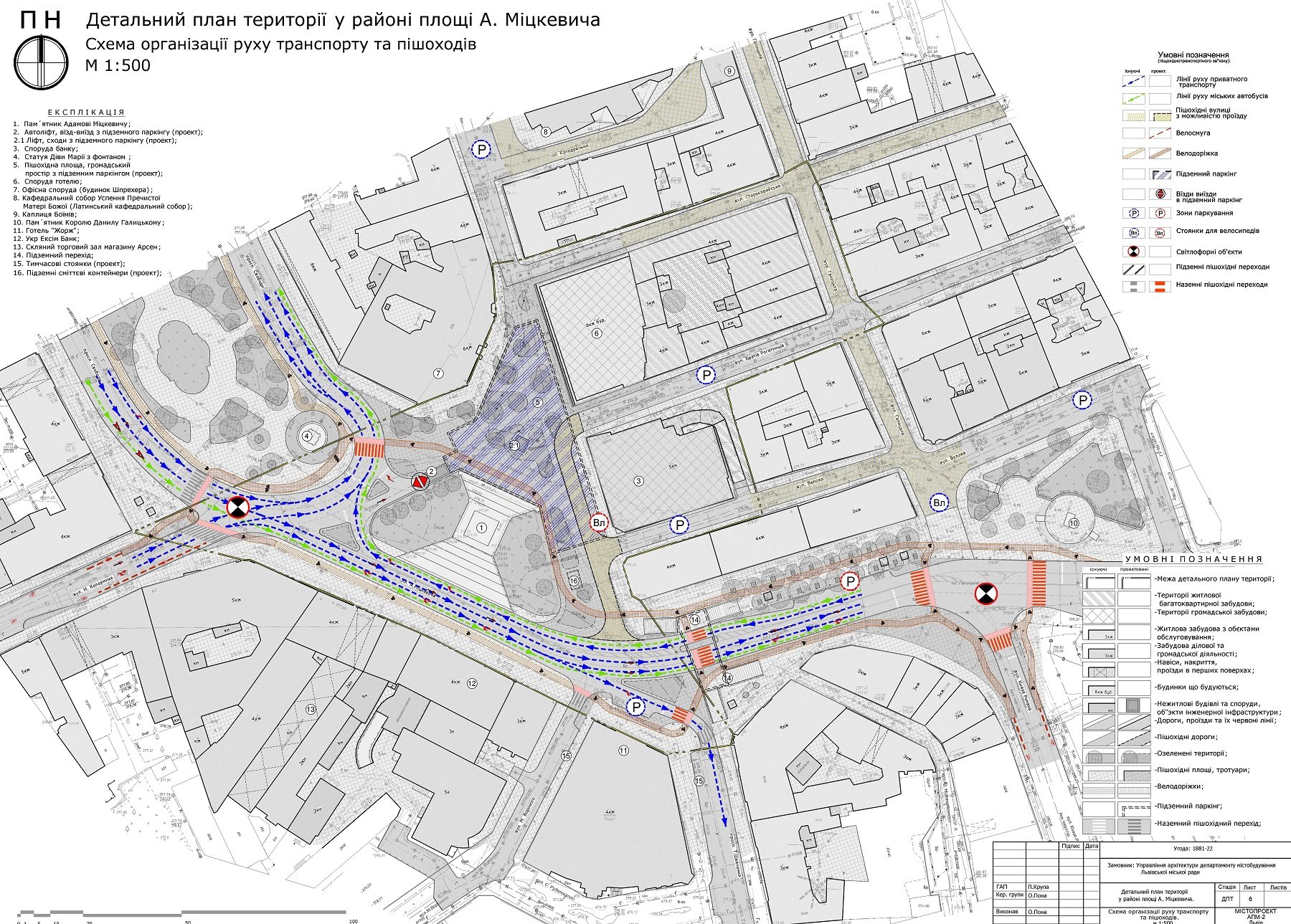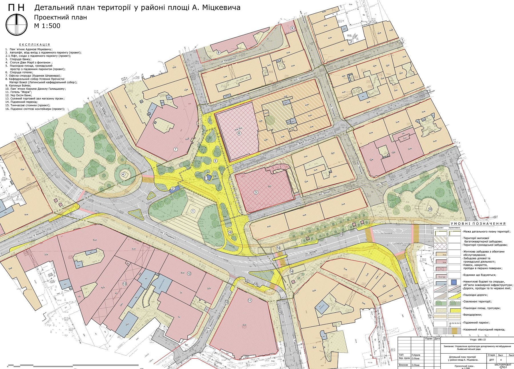 Згідно з ДПТ, що охоплює площу 1,66 га, під пам’ятником Адаму Міцкевичу в центрі Львова збудують однорівневий підземний паркінг на 40 місць. Заїзди та виїзди з паркінгу облаштують із обох сторін пам’ятника Міцкевичу. Крім цього, сміттєві контейнери, що зараз розташовані на площі, замінять на підземні.