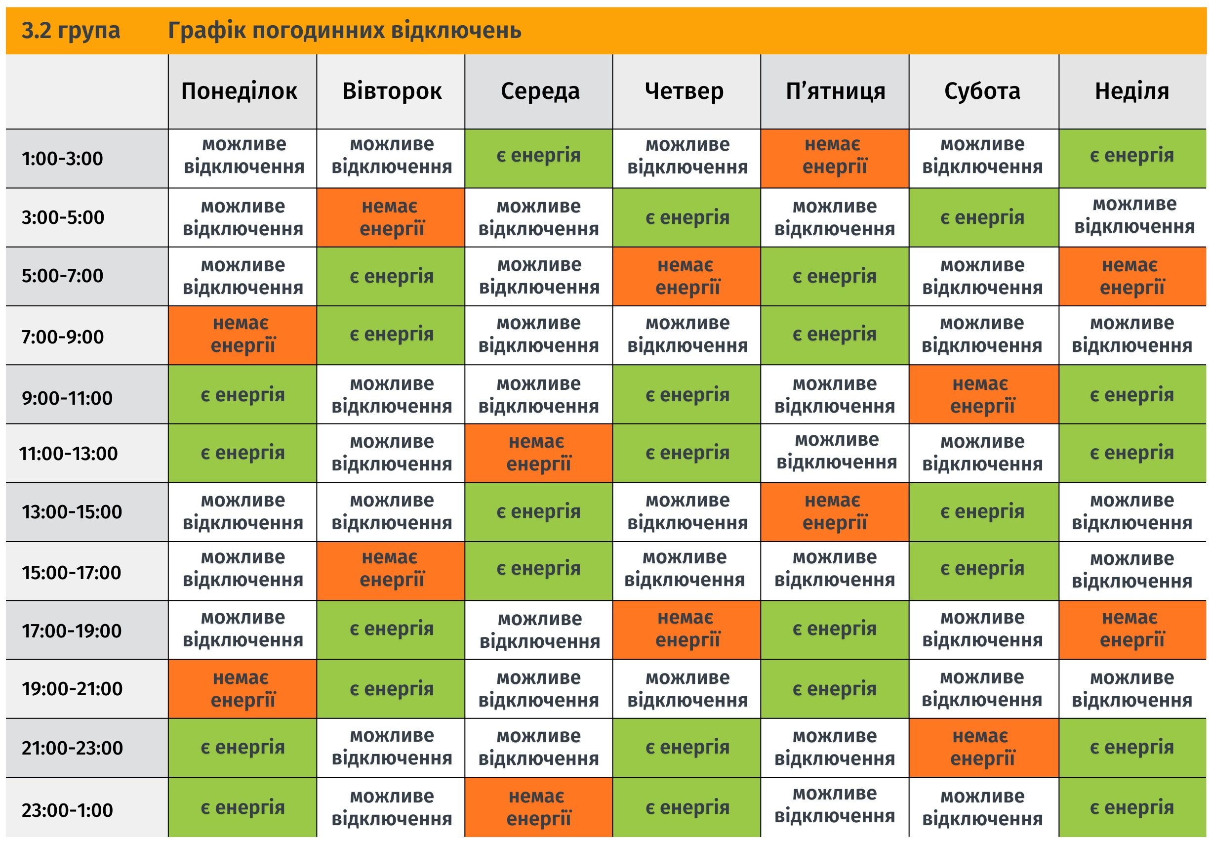 Ця інформація є уточненням, які саме години у червоних та білих періодах постійного графіку (можливі відключення) будуть знеструмлені для кожної групи цієї доби, відповідно до розпоряджень НЕК «Укренерго».