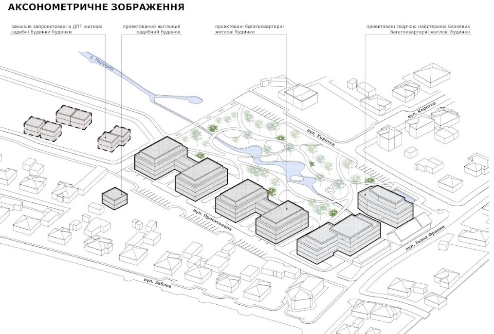 Поміж ЖК планують змінити русло річки Марунька, розширивши водойму в межах нового скверу на 0,61 га з дитячими та відпочинковими майданчиками. Два технічні озера, що розташовані в межах ділянки, пропонують перенести на північ, ближче до річки, та влаштувати річковий колектор зі скляним покриттям.![]()