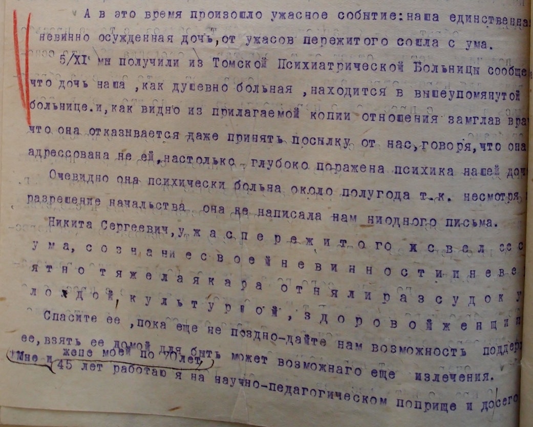 Це уривок з листа. Як бачимо, Черняхівському казали, що Вероніка втратила розум, перебуває в психлікарні у Томську та відмовилася брати посилку від батьків.