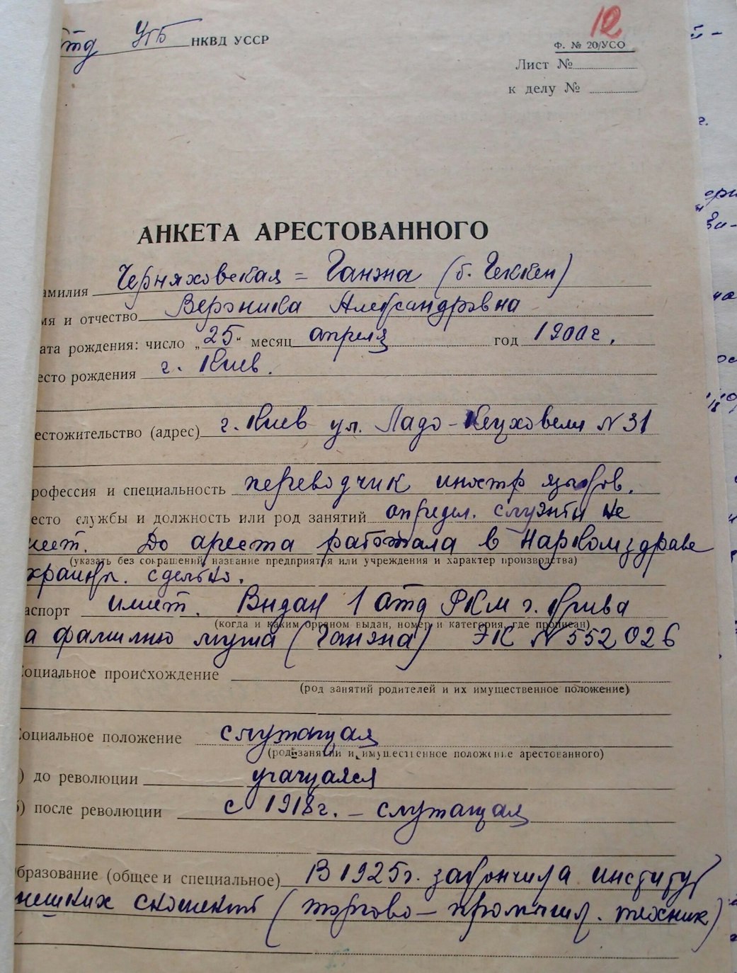 Анкета арештованої. Згадані її мати – письменниця Людмила Старицька-Черняхівська (донька Михайла Старицького), так само жертва репресій, та батько – видатний лікар, професор Олександр Черняхівський.