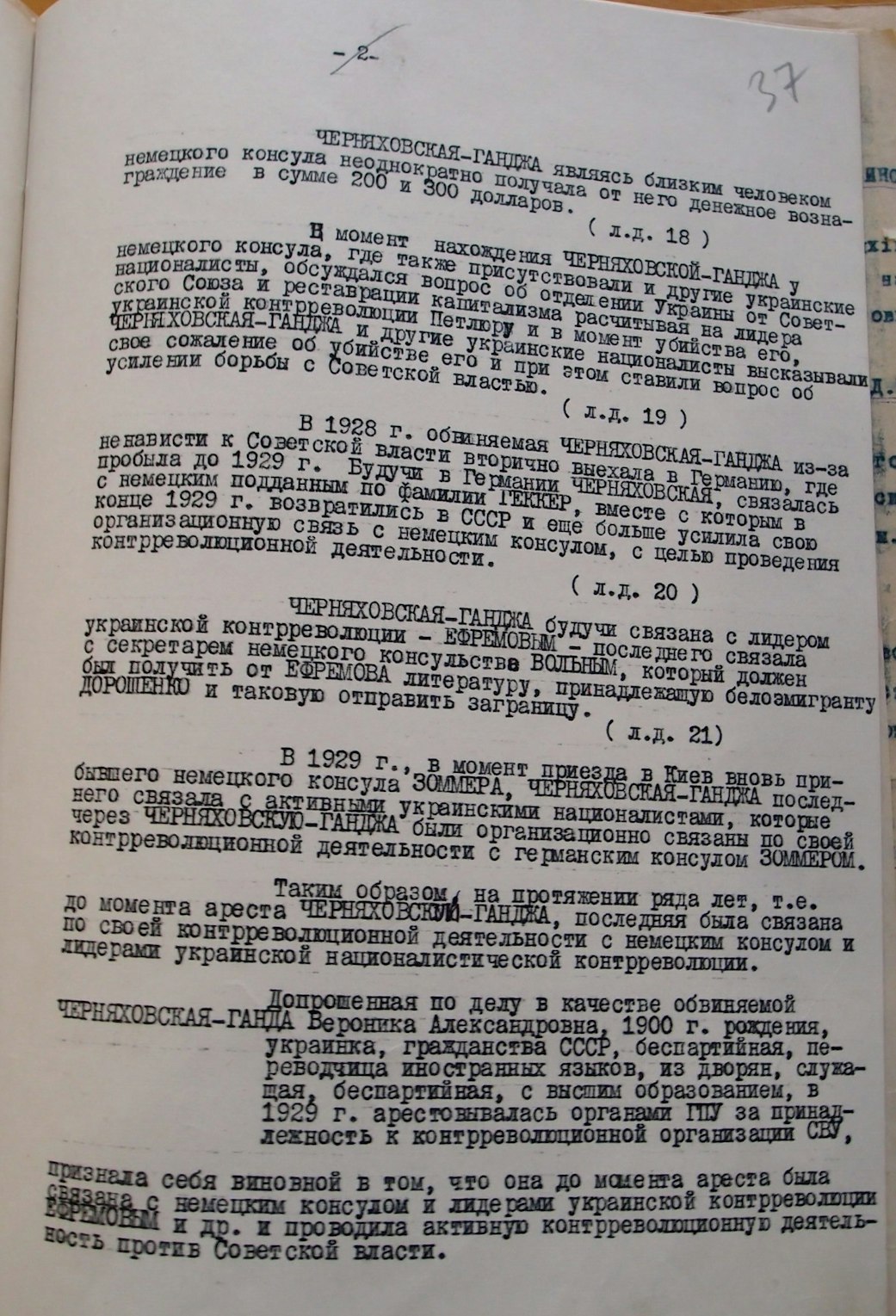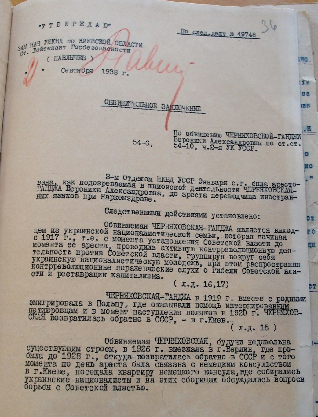 А це обвинувальний висновок, у якому викладена суть справи. Підкреслюється, що Вероніка походить української націоналістичної родини. Антирадянські погляди, зв’язки з петлюрівцями, німцями та відомим українським діячем Сергієм Єфремовим – доволі типові обвинувачення того часу.