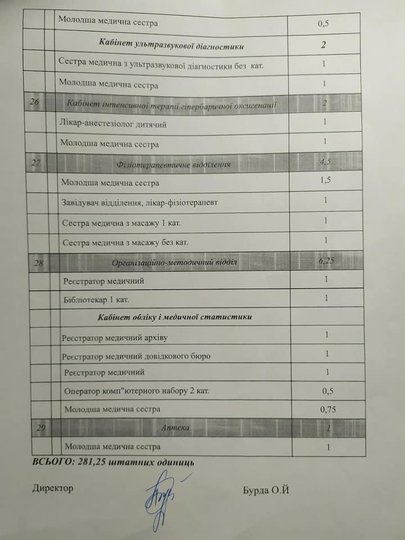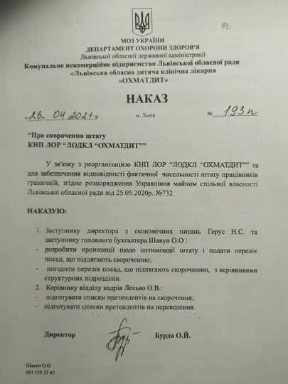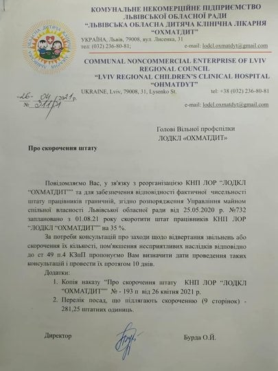 Наприкінці квітня цього року директорка лікарні Олександра Бурда підписала наказ «Про скорочення штату КНП ЛОР «ЛОДКЛ «ОХМАТДИТ», відповідно до якого доручила провести розрахунки та надати пропозиції щодо посад, які підлягають скороченню. Проте того ж дня у листі до голови профспілки лікарні Олександра Бурда уже чітко повідомляє про скорочення штату на 35% (281,25 штатних одиниць) уже до 1 серпня 2021 року, а також наводить детальний список запланованих до скорочення посад.