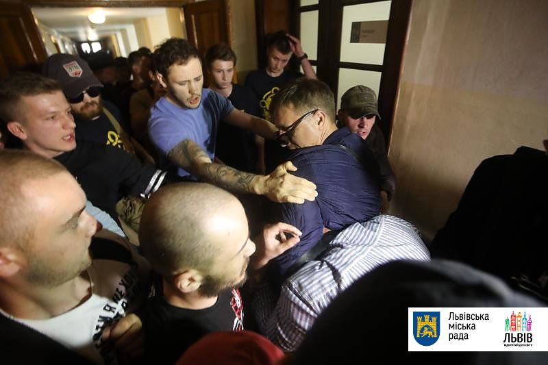 Протестувальники не захотіли слухати посадовців міської ради та почали виламувати двері до міської ради. Почалася штовханина та бійка.