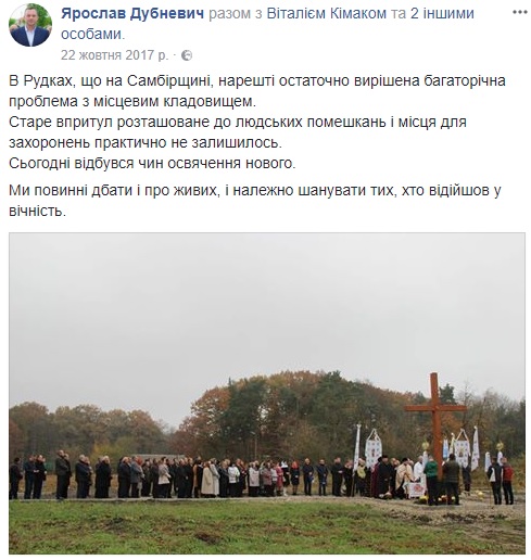 «Нарешті остаточно вирішена багаторічна проблема з місцевим кладовищем», – написав народний депутат Ярослав Дубневич.