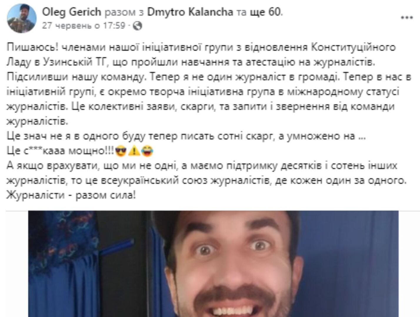 «По закінченню курса всі учасники, що виконали завдання – отримують посвідчення журналіста міжнародного зразка. Участь можна брати також тим хто знаходиться за кордоном. Посвідчення буде вислано в любу країну», – повідомляє Олег Герич (правопис допису збережено. Варто зазначити, що дописи Стахіва і Герича, які називають себе викладачами журналістики, містять помилки).