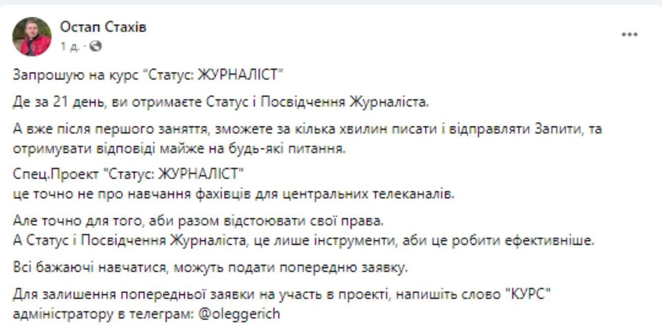 Підозрюваний у справі про повалення конституційного ладу в Україні, скандальний львівський псевдоактивіст і антивакцинатор Остап Стахів оголосив про відкриття «курсів журналістики» та видачу «посвідчень журналіста» після їх закінчення. Курси будуть платними, відбуватимуться онлайн і триватимуть 21 день. Після завершення курсу учасникам обіцяють видати посвідчення журналіста міжнародного зразка. У прес-службі СБУ у Львівській області розповіли ZAXID.NET, що стежать за діяльністю Стахіва, але не можуть притягти його до відповідальності за викладання. Сам Стахів не приховує, що курси проводить не для того, щоб його учасники могли працювати в медіа, а для «боротьби за свої права».