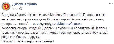 “Сьогодні 40 днів, як немає з нами Марини Поплавської. Православні вірять, що на сороковий день Душа покидає Землю – але ми знаємо, тепер ти – наш Ангел. І відчуваємо #МаринаЗнами… Королева гумору, Мудра, Добра, Глибока і Талановита Людина – тебе, як і раніше, люблять мільйони. Тебе не перестанемо любити ми, рідні і близькі, друзі. Низький уклін і гори твоя Зірка!” — написали в “Дизель шоу”.