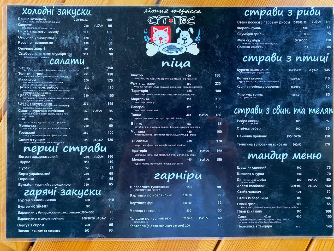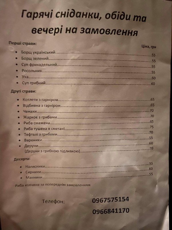 У кафе і ресторанах пропонують борщ, окрошку, розсольник, європейські салати, піцу, різноманітне м’ясо. Ціни на перше стартують від 60 грн, на друге – від 80.
