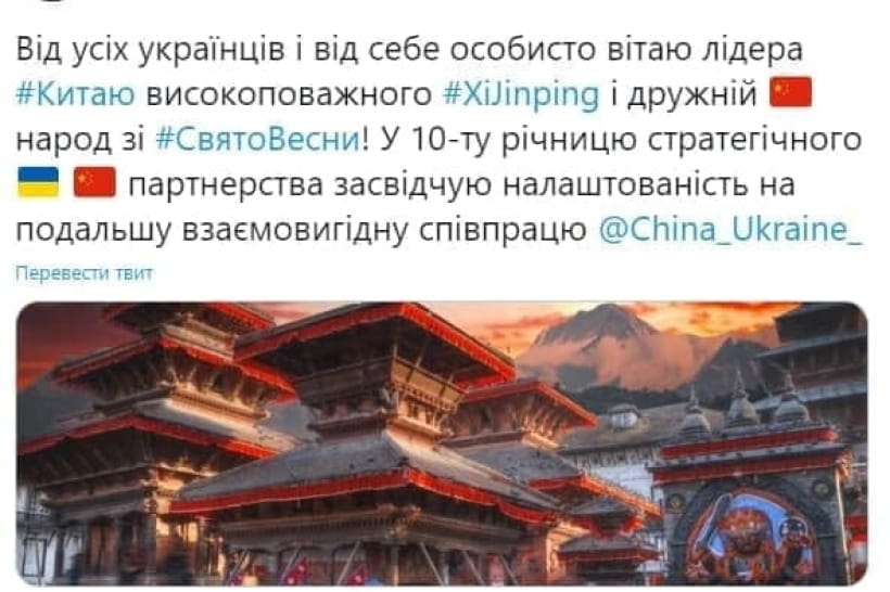 谨代表本人以及全乌克兰人民祝贺中国人民的最高领袖、国家主席习近平阁下以及友好的中国人民新春愉快!万事如意!在两国庆祝建立战略合作伙伴关系十周年的今年, 本人表示愿意继续扩大乌中互惠互利合作! pic.twitter.com/SBUyrBTM74