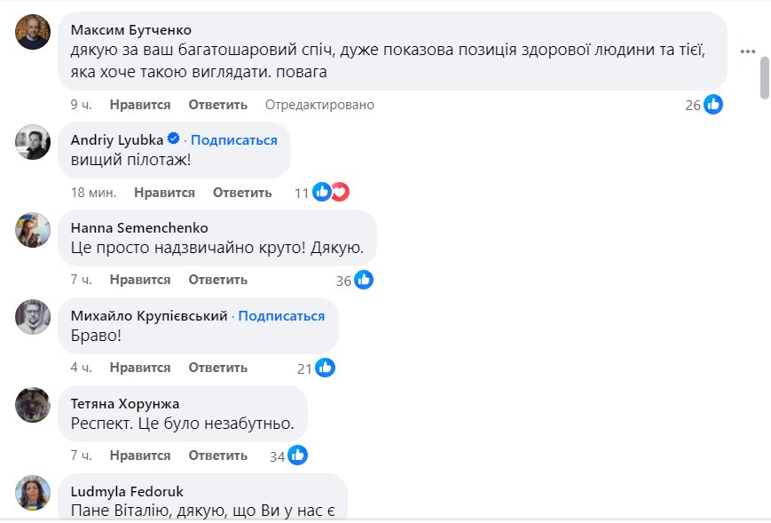 «Коли український спортсмен перемагає російського — українці аплодують. Коли український інтелектуал вступає в суперечку російським — його засуджують. Віталій Портников чудово продемонстрував, що росіян можна і треба розмазувати не лише на спортивних майданчиках», — підтримав Портникова Володимир В’ятрович.