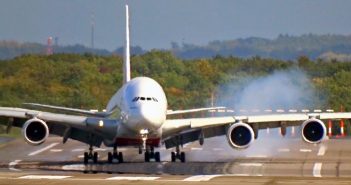 Пасажирський літак Airbus А380 авіаліній Emirates Airline здійснює посадку в аеропорту Дюссельдорфа під час сильних…