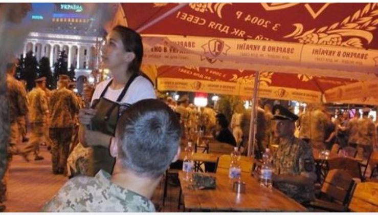 І так як ноги відвалювалися у всіх, і у мене в тому числі, ми пішли присісти в довколишні кафе. Там було абсолютно порожньо. І військові розсілися за столики, що стояли на вулиці. Попросили води. Не за так, а купити. На що отримали відповідь, що води в кафе немає. Деякі замовили лимонад за 35 грн. Решта попросили просто посидіти 15 хвилин, поки у них перерва, а клієнтів в кафе все одно немає. На що отримали відмову і вимогу забиратися із закладу.